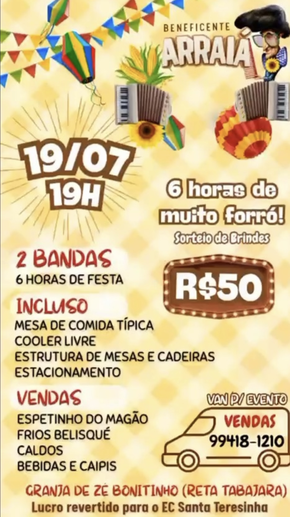 Detalhe: o lucro da festa será revertido ao EC da igreja Santa Teresinha.