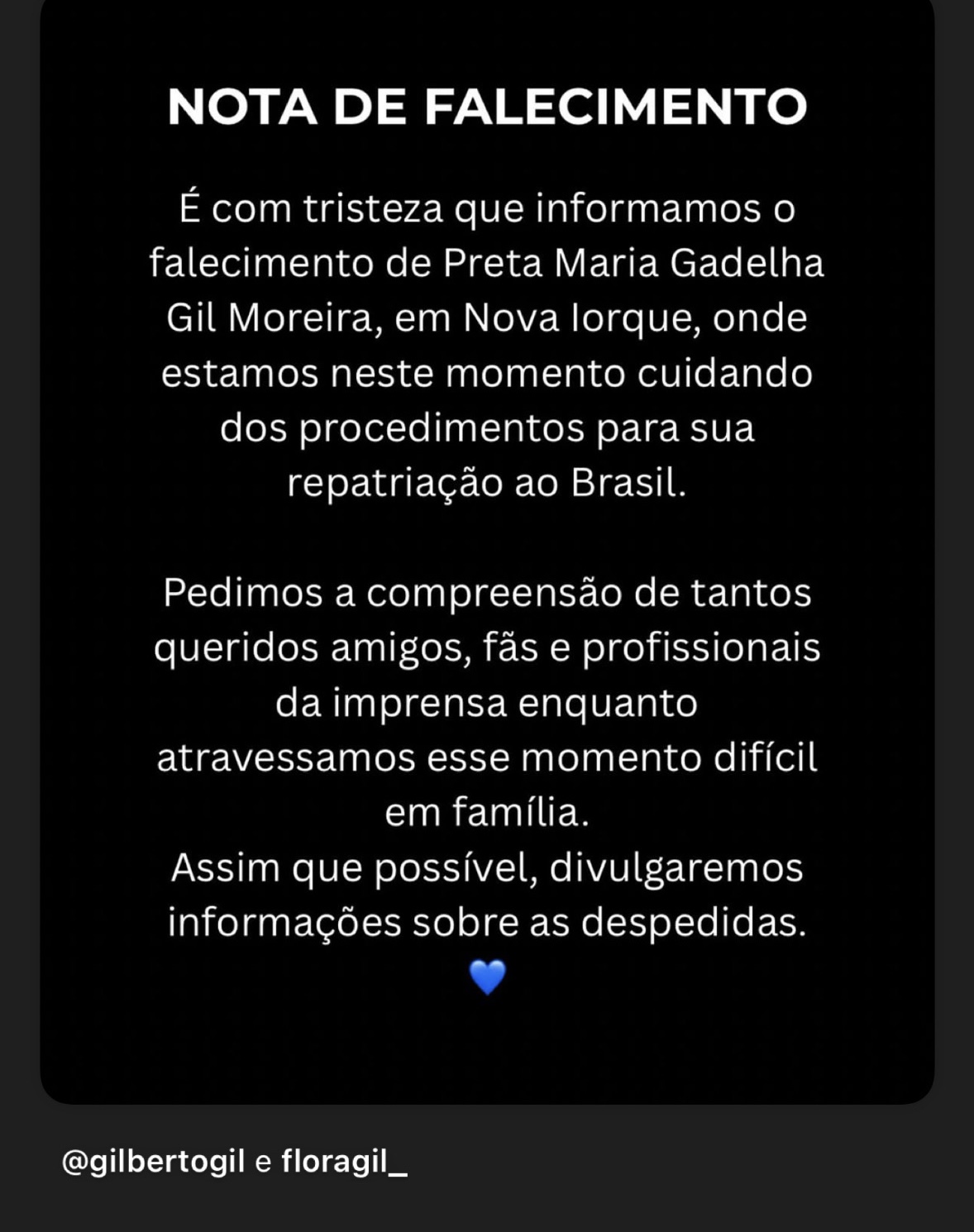 É com tristeza que informamos o falecimento de Preta Maria Gadelha Gil Moreira, em Nova lorque, onde estamos neste momento cuidando dos procedimentos para sua repatriação ao Brasil.