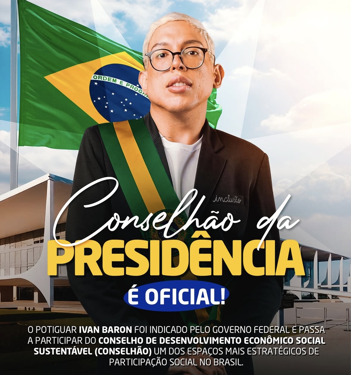 Orgulho do Rio Grande do Norte - do Rio Grande do Norte que tem empatia e respeita diversidades - o influenciador e ativista Ivan Baron, foi indicado pelo governo Lula para integrar o Conselho de Desenvolvimento Econômico Social Sustentável (CDESS), conhecido como o “Conselhão da Presidência”.