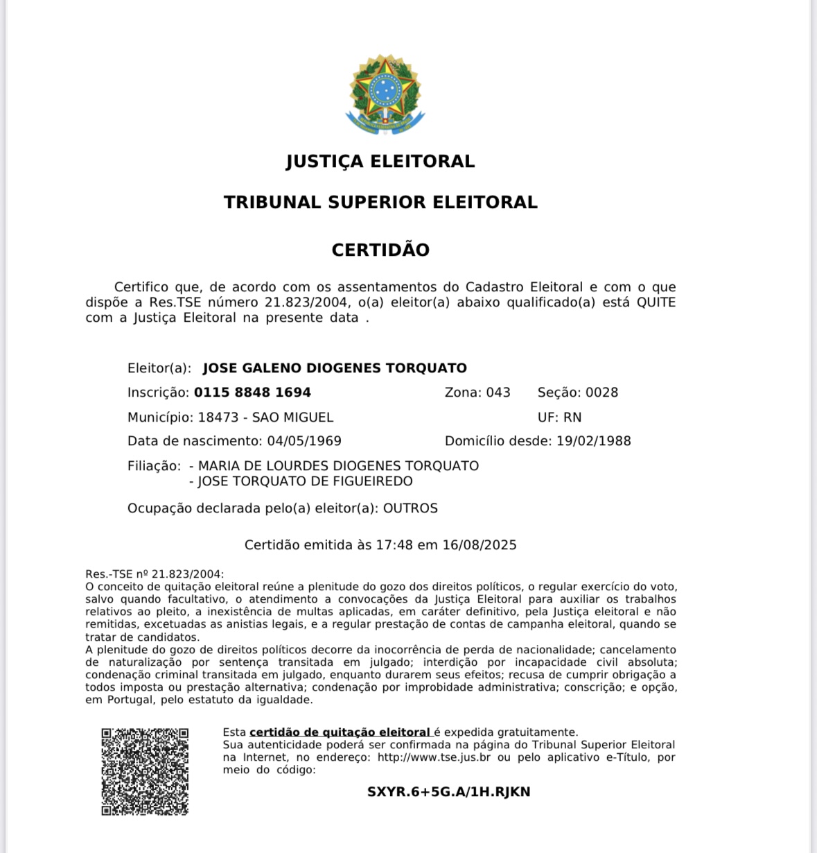 Aliás, basta consultar a Justiça Eleitoral para se constatar que a minha situação é de absoluta regularidade, conforme certidão que torno pública.