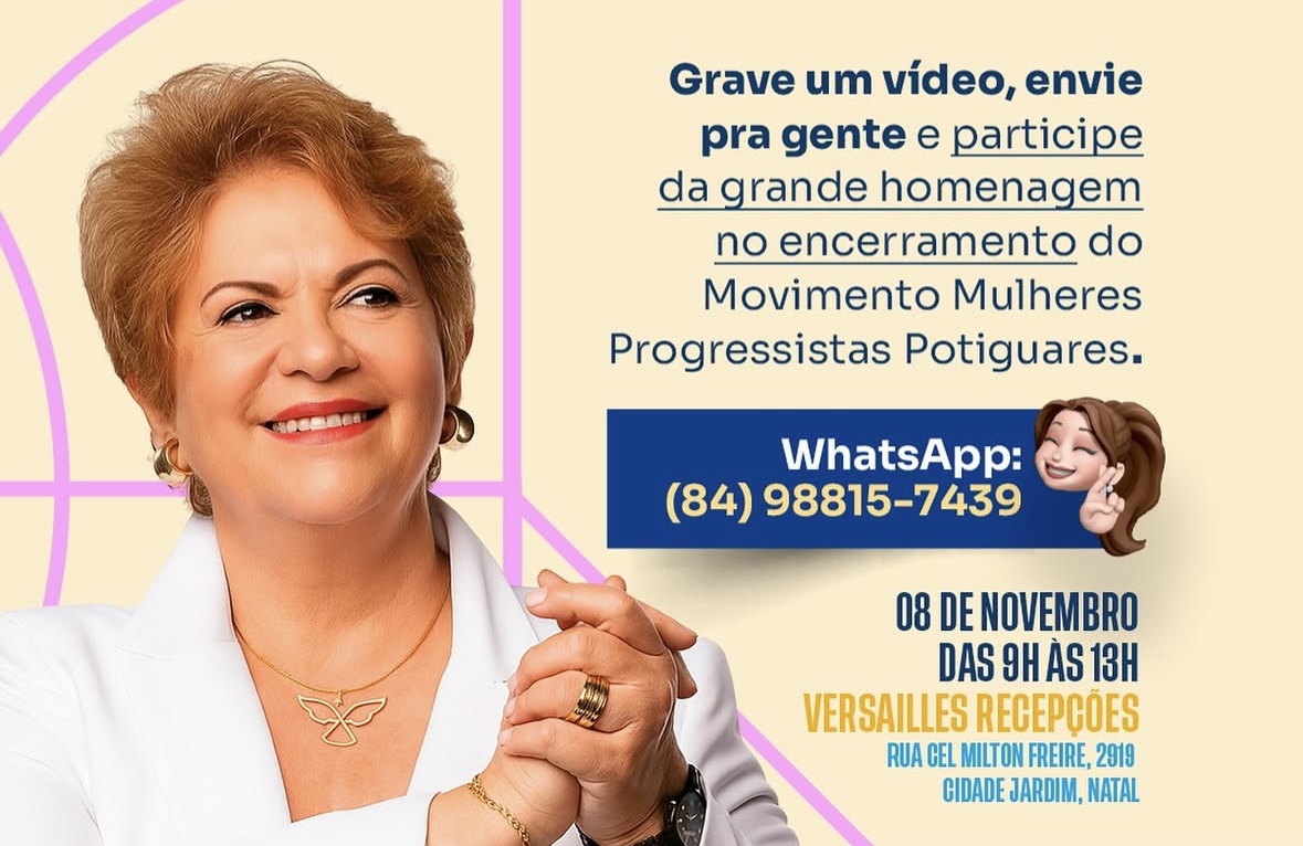 O Movimento Mulheres Progressistas Potiguares (MPP), liderado por Shirley Targino, presidente do PP Mulher do RN, encerra seu ciclo no dia 8 de novembro, das 9h às 13h, no Versailles Recepções, em Natal.