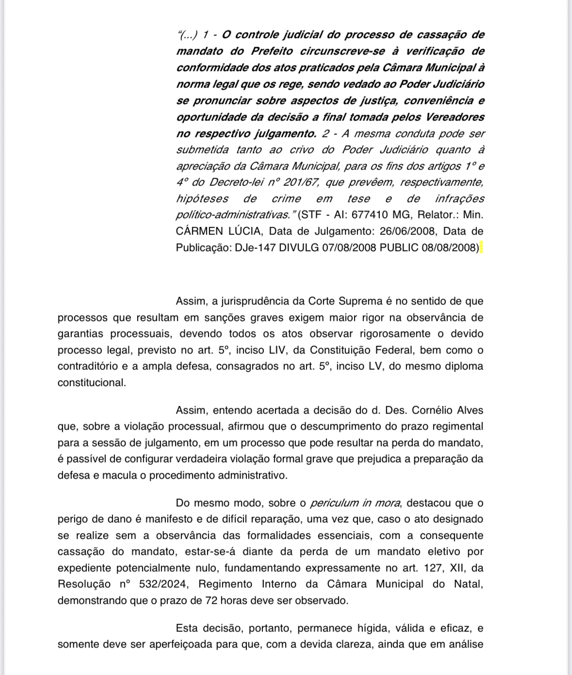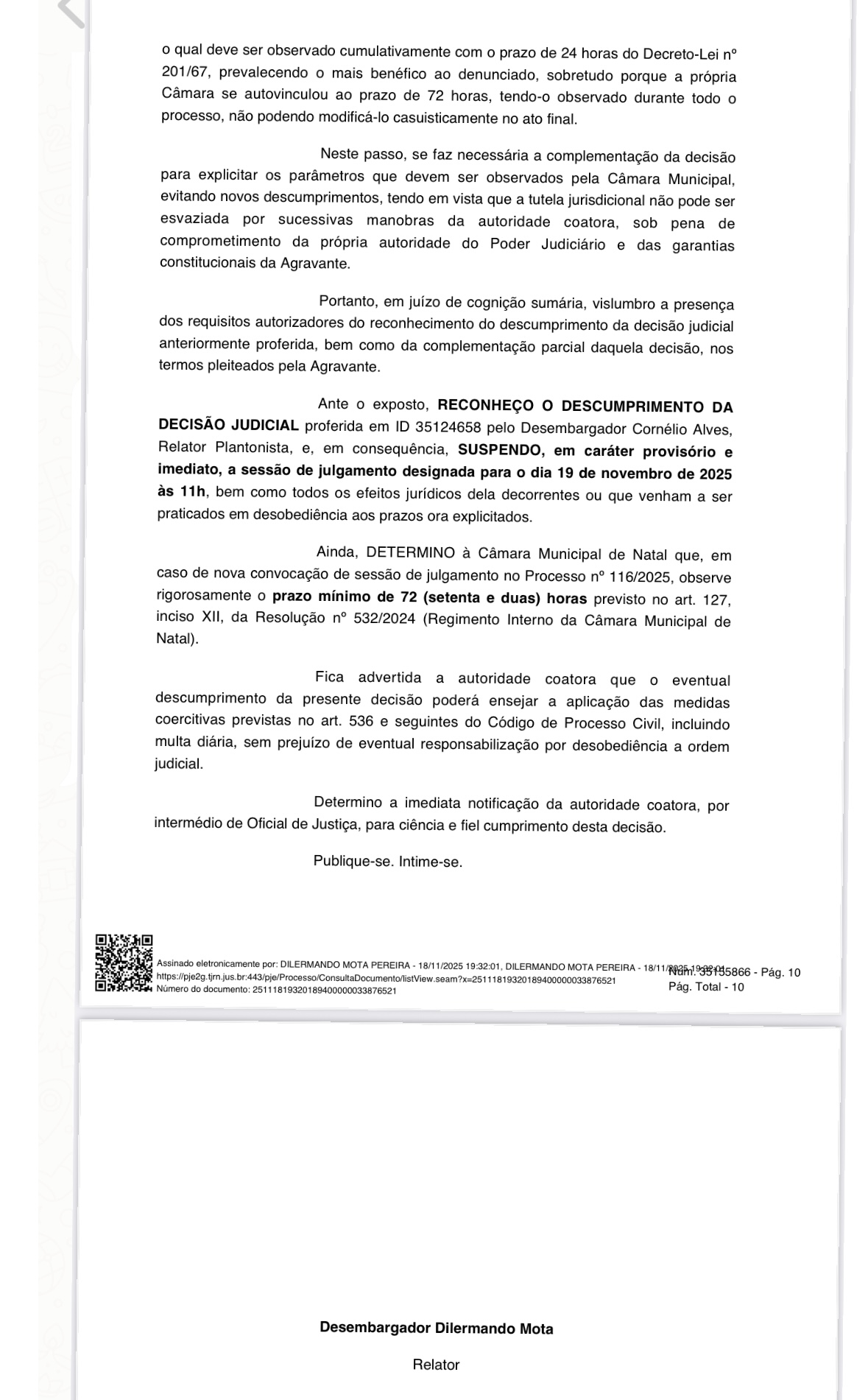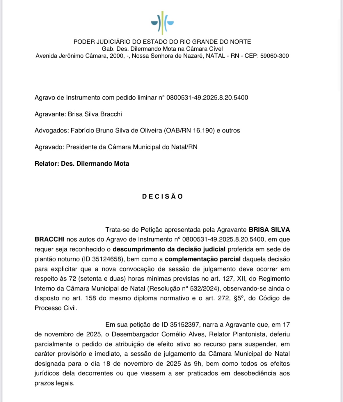O desembargador Dilermando Motta, do Tribunal de Justiça do RN, acaba de proferir decisão mantendo a decisão desta terça-feira (18), do desembargador Cornelio Alves, suspendendo a sessão de cassação da vereadora Brisa Bracchi (PT).